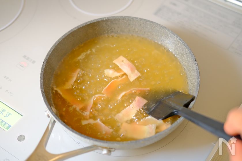 (3) 同じフライパンに【A】を入れて混ぜ、片栗粉を完全に溶かしたら、短冊切りにしたベーコン(ハーフサイズ)を加える。中火(IHヒーター火力ランプ[4])で加熱し、ふつふつと煮立ってとろみがつくまで混ぜながら加熱する。