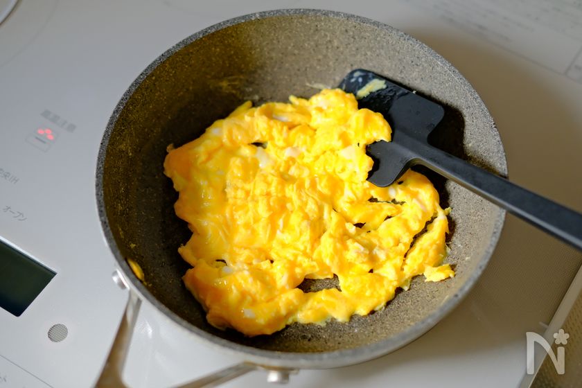 手順2の卵液の加熱時間は20秒程度です。余熱でも火が通るので、フライパンに置いたままにしないようにします。