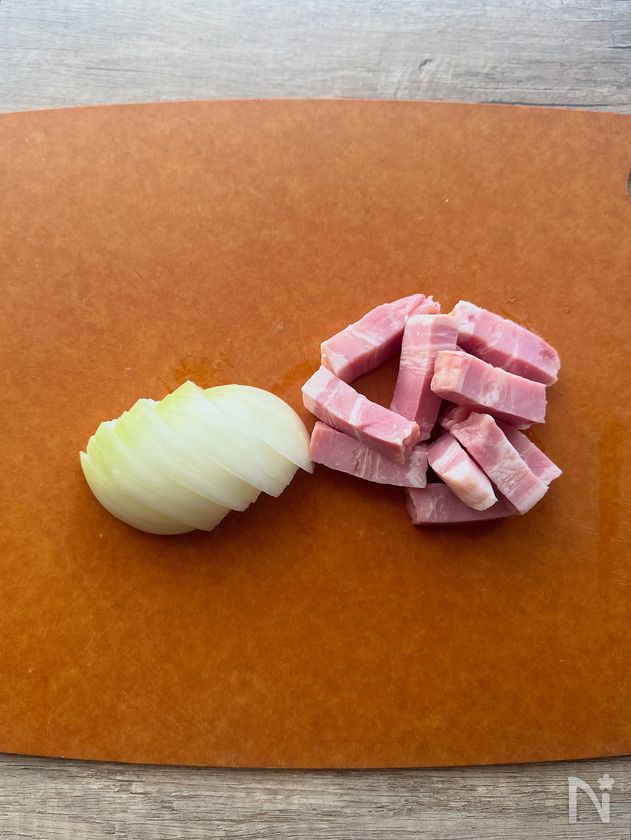 (2) 加熱している間に、新玉ねぎは7〜8mm幅の薄切り、ベーコン(厚切り)は1cm幅の短冊切りにする。