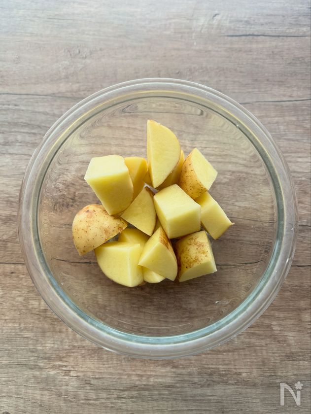 (1) 新じゃがいもは小さめのひと口大に切り、耐熱ボウルに入れて、ふんわりラップをして電子レンジ(600W)で5分加熱する。