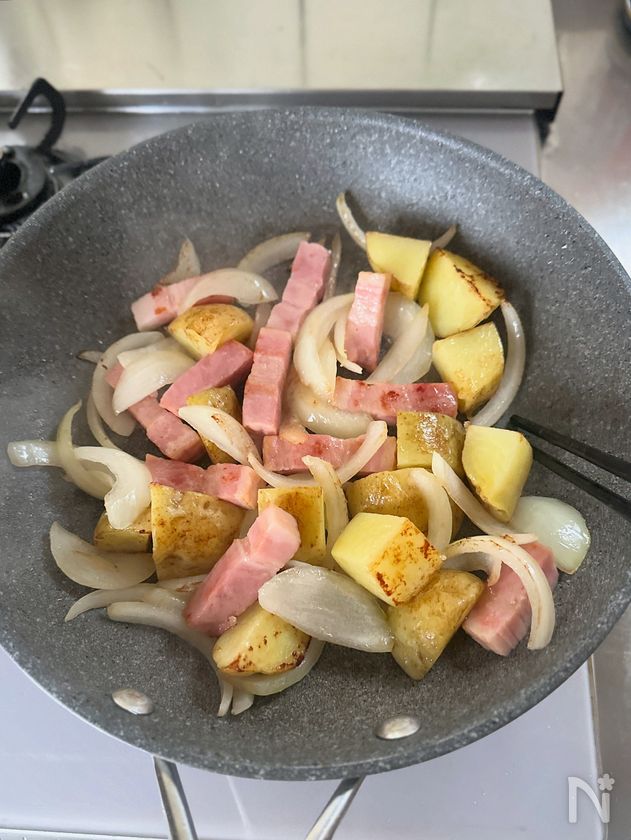 (3) フライパンにサラダ油を入れて中火で熱し、新じゃがいも、新玉ねぎ、ベーコン(厚切り)を加えて焼き色をつけるように炒める。