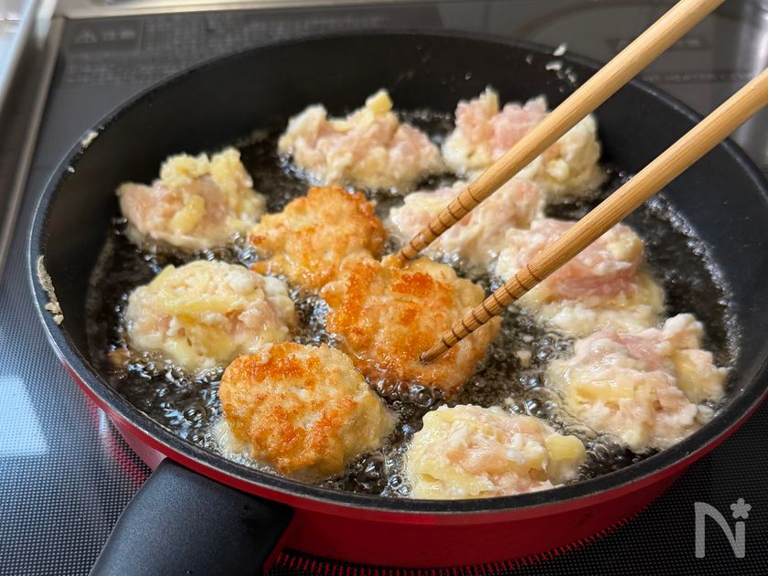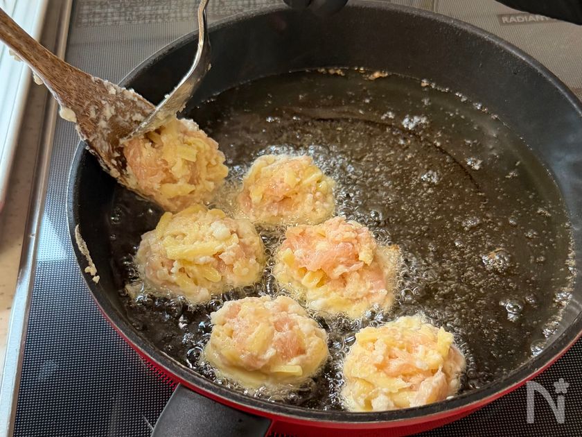(3) フライパンに5mm高さ程度の油を入れて中火で180℃に熱し、2をスプーンで丸めてやさしく落とす。