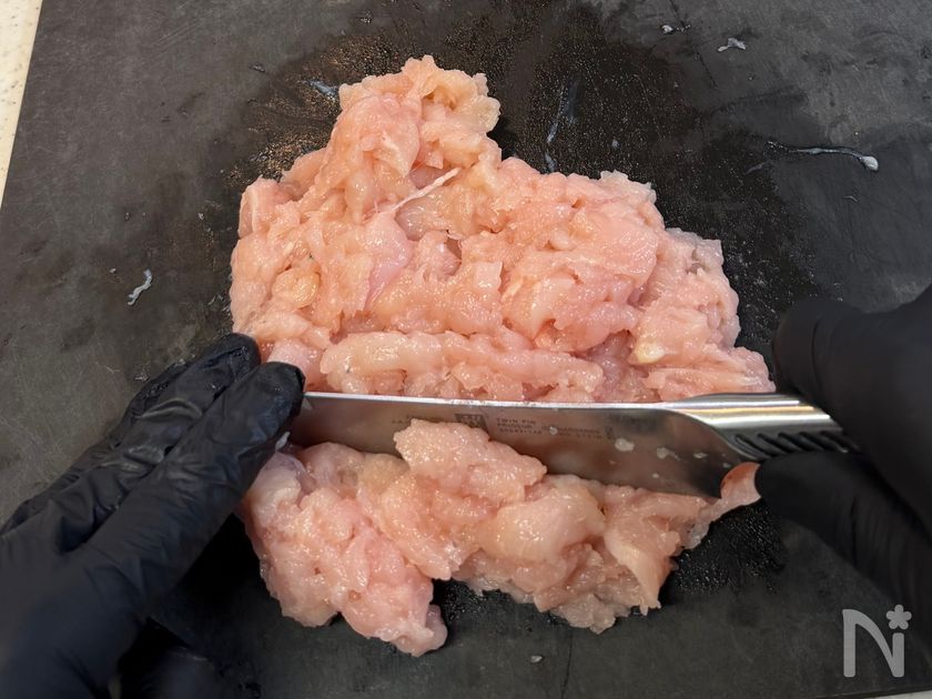 鶏むねは食感を残す程度に細かく刻むことで、食べ応えがありつつふわふわした食感になるのでオススメです!