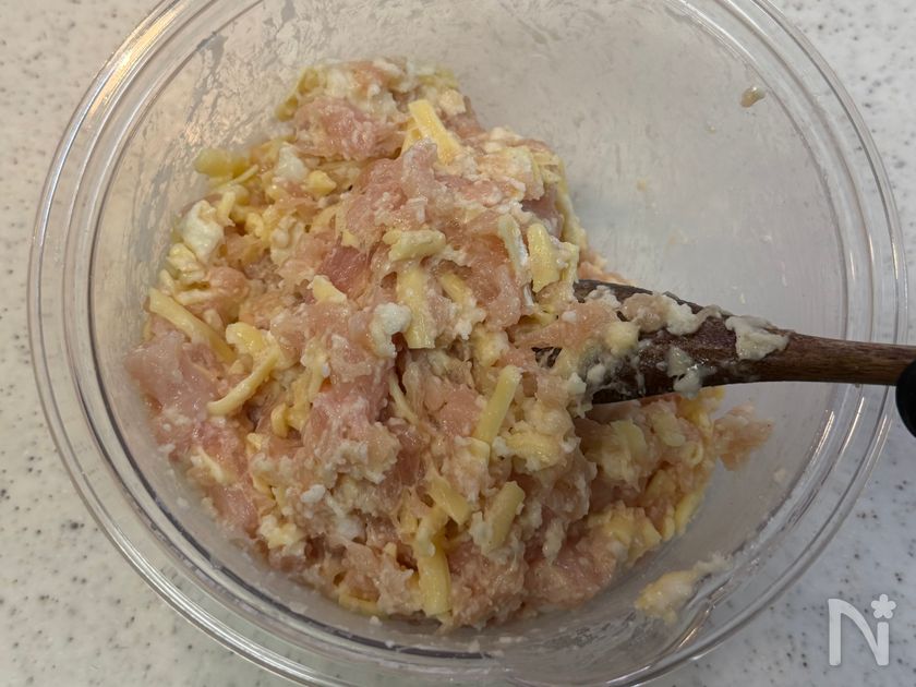 (2) ボウルに鶏むね肉、ピザ用チーズ、袋の上からよく揉んで潰したはんぺん、【A】を加えてよく混ぜ合わせる。