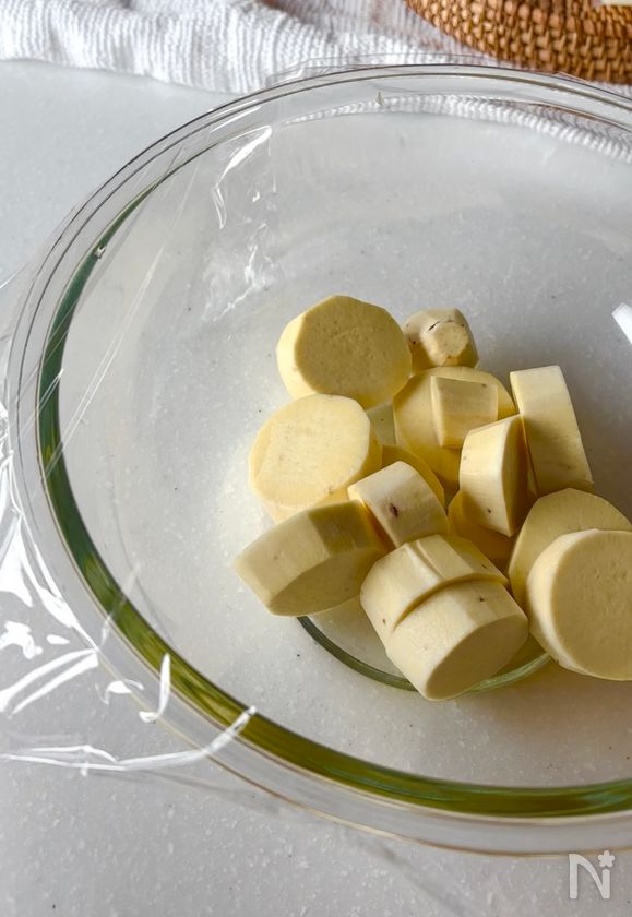 (1) 【A】は皮を剥いてひとくち大に切り、耐熱容器に大さじ1の水と共に入れて600wの電子レンジで5分加熱する。