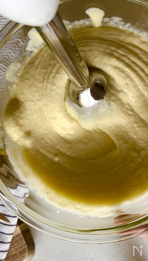 (2) さつまいもの粗熱がとれたら、【B】を全て加え、ハンドブレンダーかミキサーで全体的に潰しながら混ぜる。
