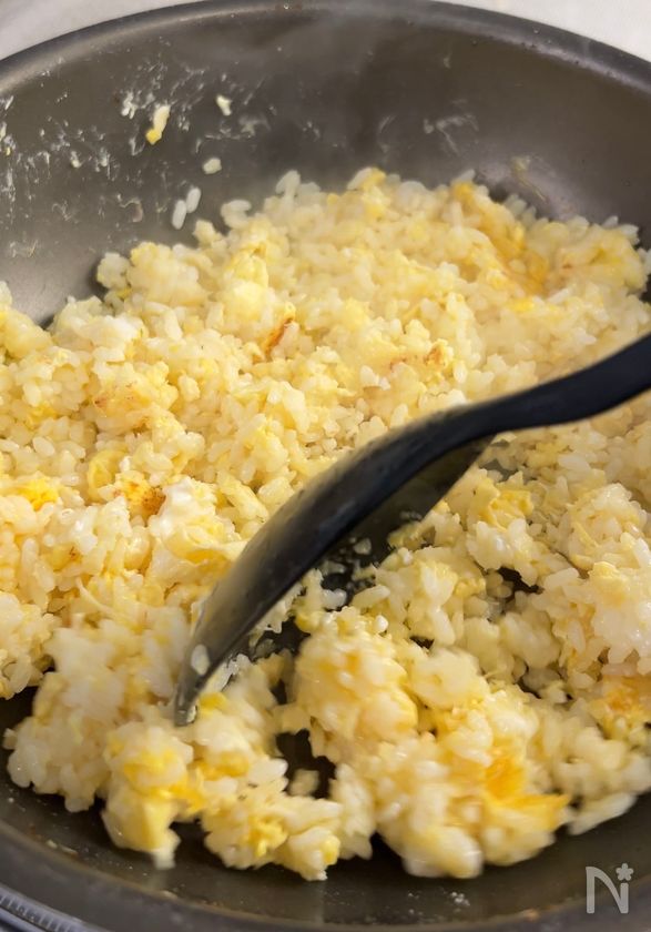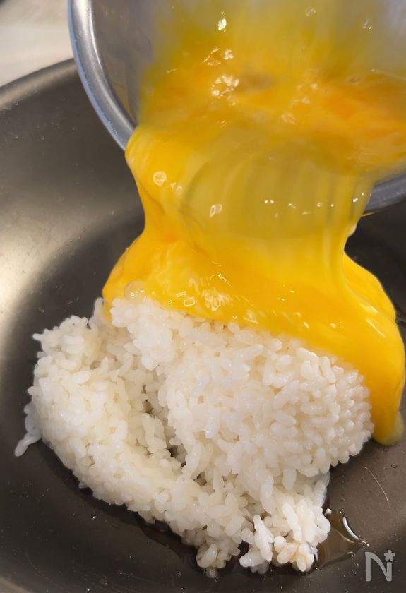 ご飯と卵液を一気に入れ、全体をさっと混ぜる。