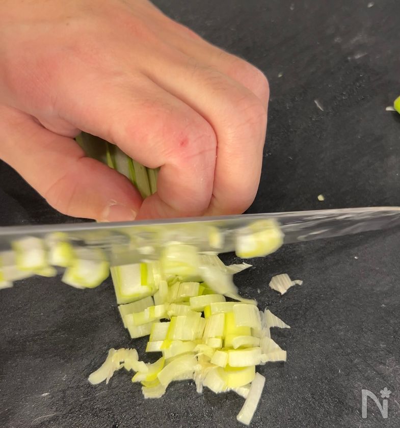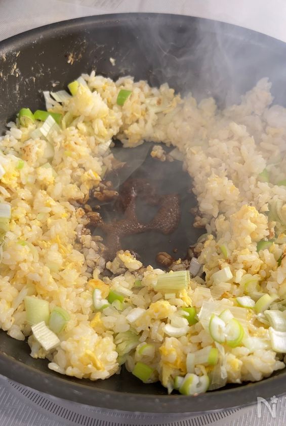 (3) 長ネギを加え、フライパンの隙間に醤油を入れて軽く焦がす。