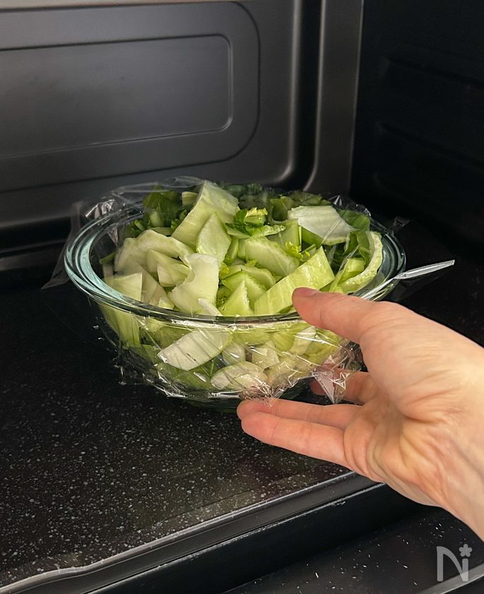 (2) 耐熱ボウルにチンゲン菜を入れ、ラップをし600Wの電子レンジで2分加熱する。