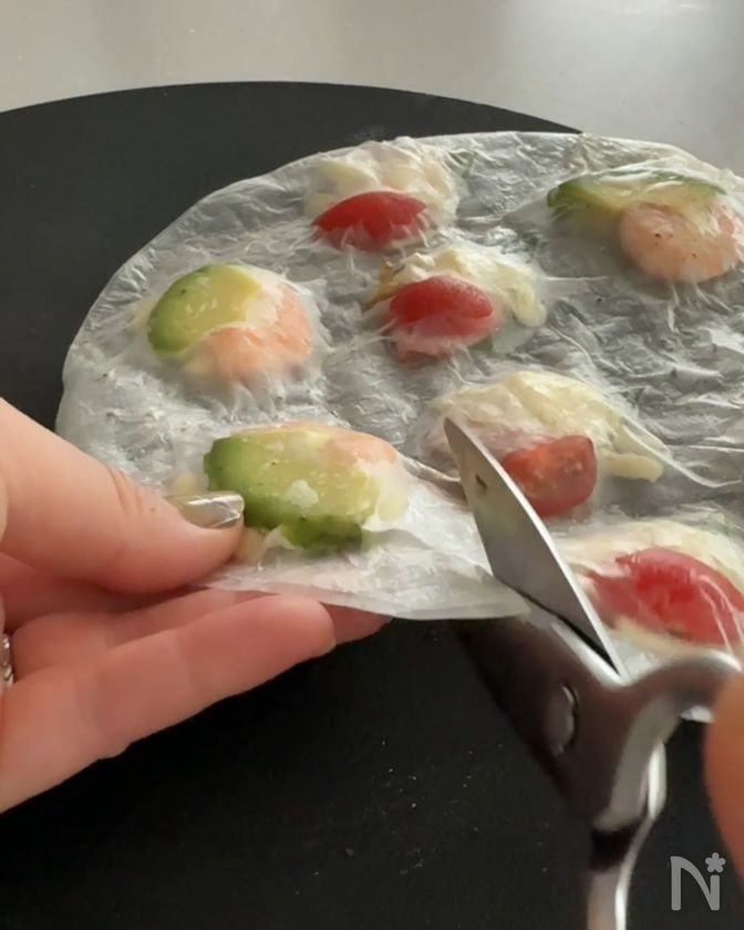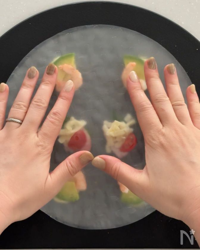 (3) 片面だけ濡らしたライスペーパーを、濡らした面を内側にして被せる
