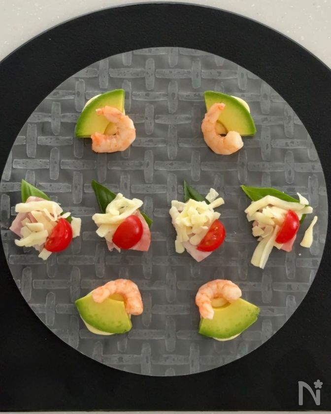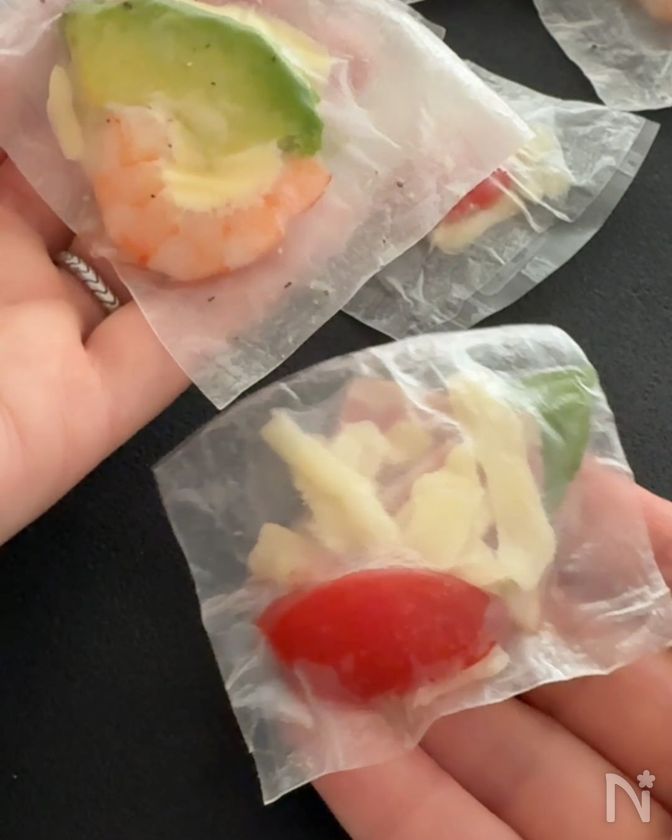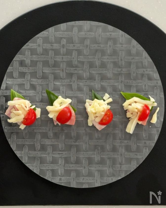 (1) ライスペーパーにバジル、シュレッドチーズ、ベーコン、ミニトマトをのせる