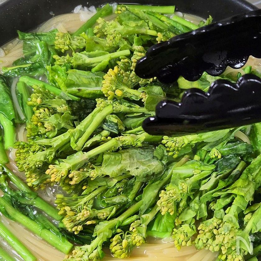 菜の花の上の部分を加えて混ぜ、1分~1分30秒煮る。