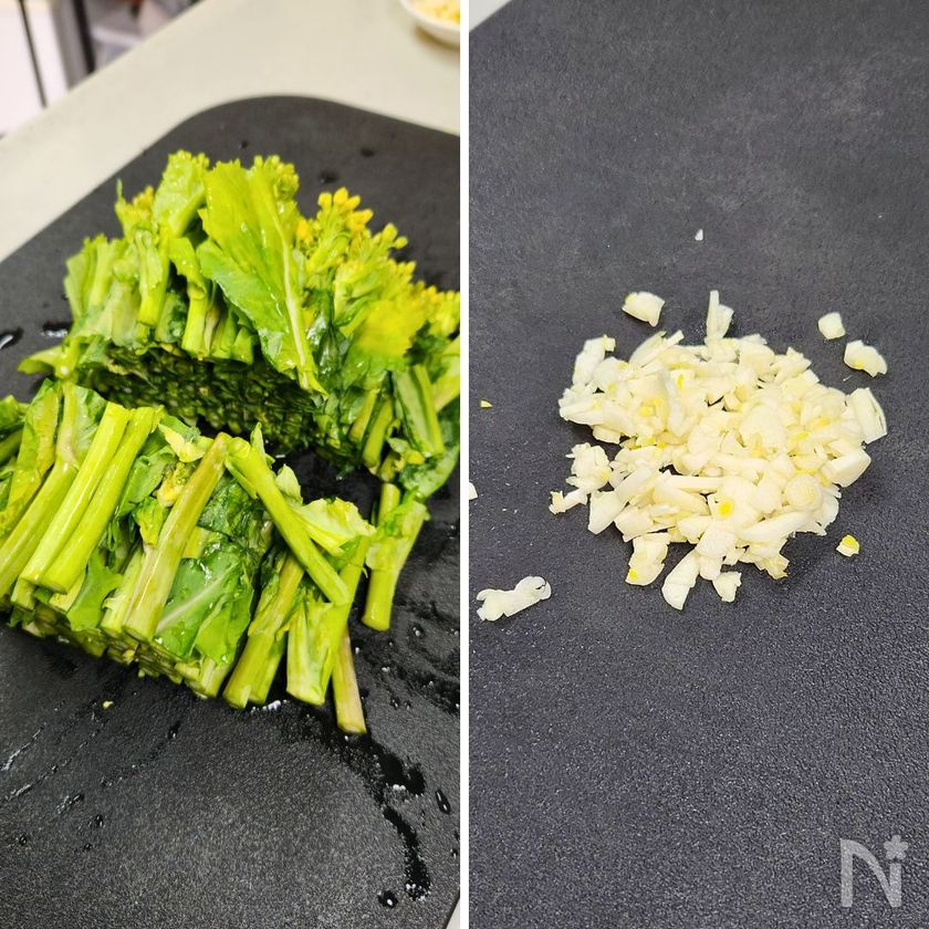 菜の花は下の部分を2cmほど切り落とし、半分に切る。