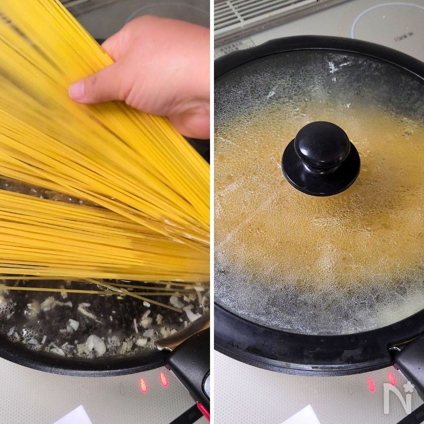 (3) スパゲッティを加えてほぐし、再沸騰したら蓋をして中火で5分煮る。