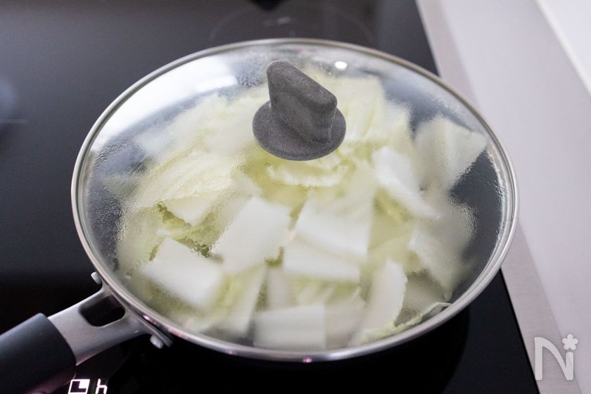 (2) 菜を加え、蓋をして中火で3分加熱する。
