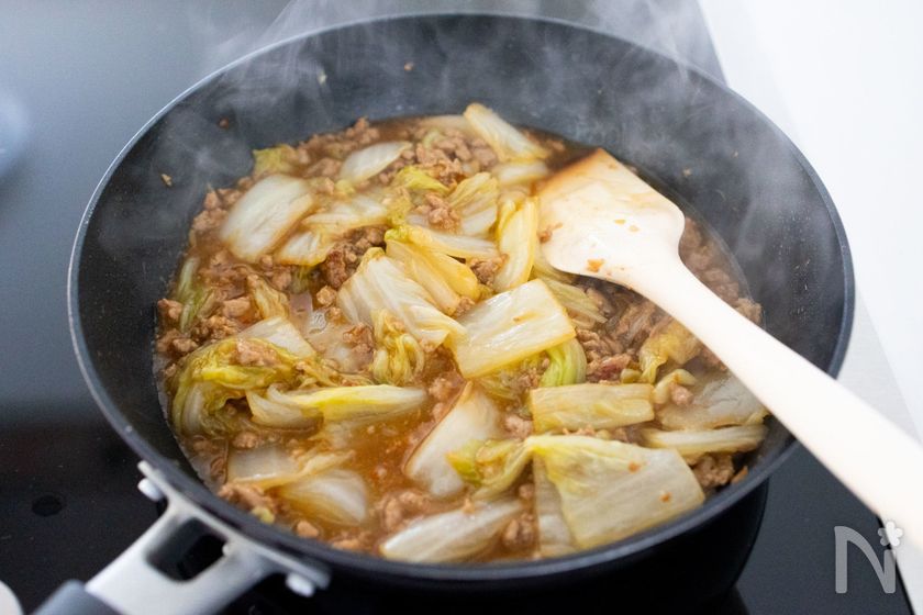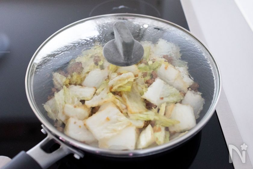 (3) ひき肉と白菜をよく混ぜ合わせ、再度蓋をして中火で5分加熱する。