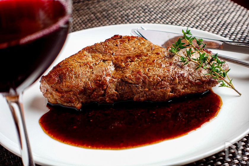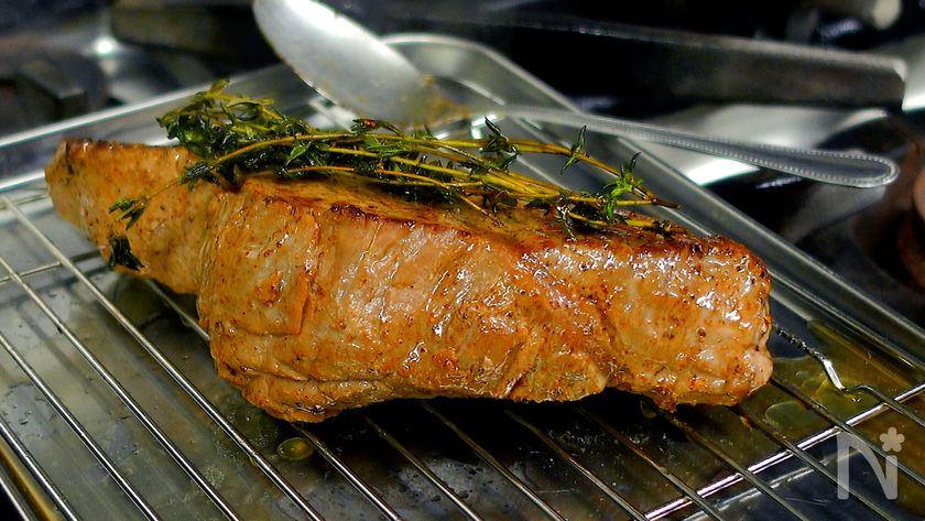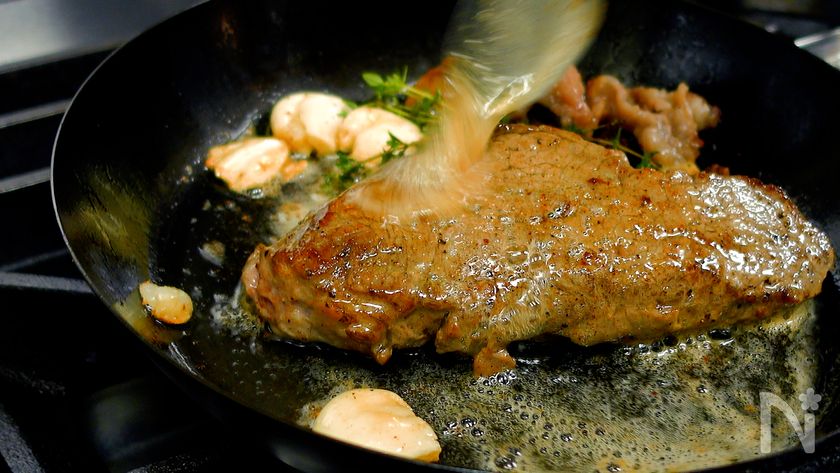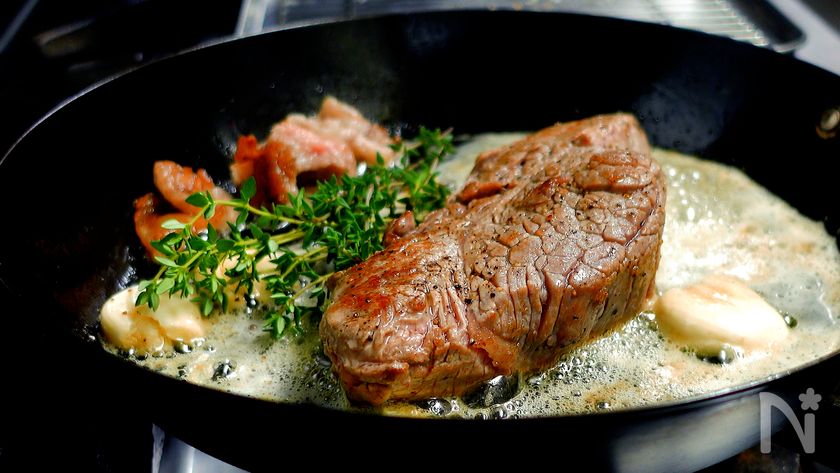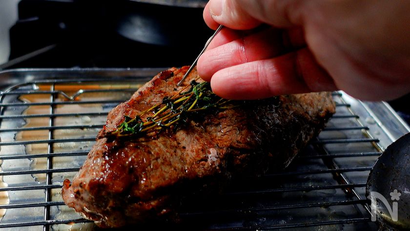 (5) 3分後、フライパンを弱火にかけ肉を戻す(3回目)。焦げないようにバター(分量外)を追加で加え、同じようにアロゼをする。片面約1分目安。両面アロゼをしたら取り出し、タイムをのせアルミホイルを被せ3分休ませる。