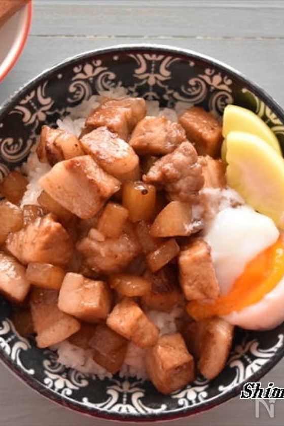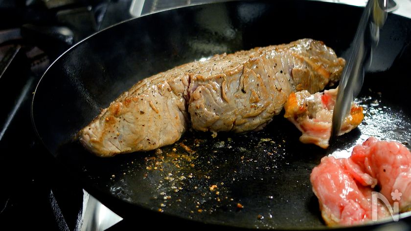 フライパンにオリーブ油をひき中火にかける。フライパンがしっかりと温まったら肉、脂身を入れ、肉の全面に焼き目をつける(1回目)。焼き目がついたら一旦取り出し、3分休ませる。