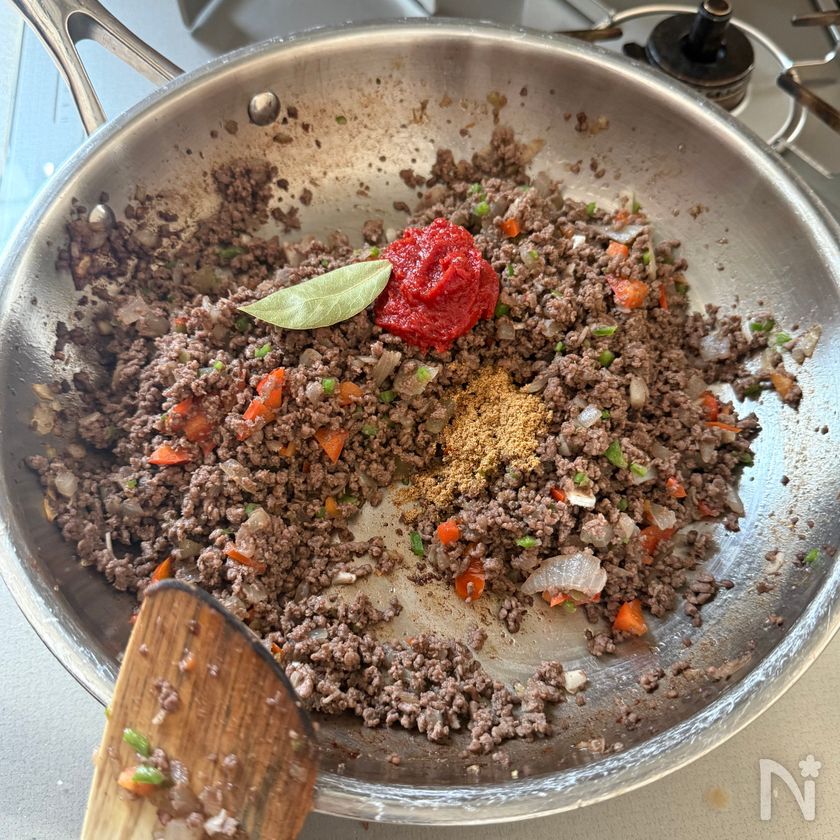 (2) トマトペースト、ローリエ、クミンパウダーを加えてさらに炒め、全体がなじんだらトマトケチャップを加えて炒める。