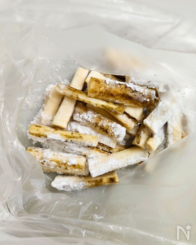 (2) ポリ袋にごぼうと片栗粉を入れてふり混ぜ、袋の上から握って片栗粉をしっかりまぶす。