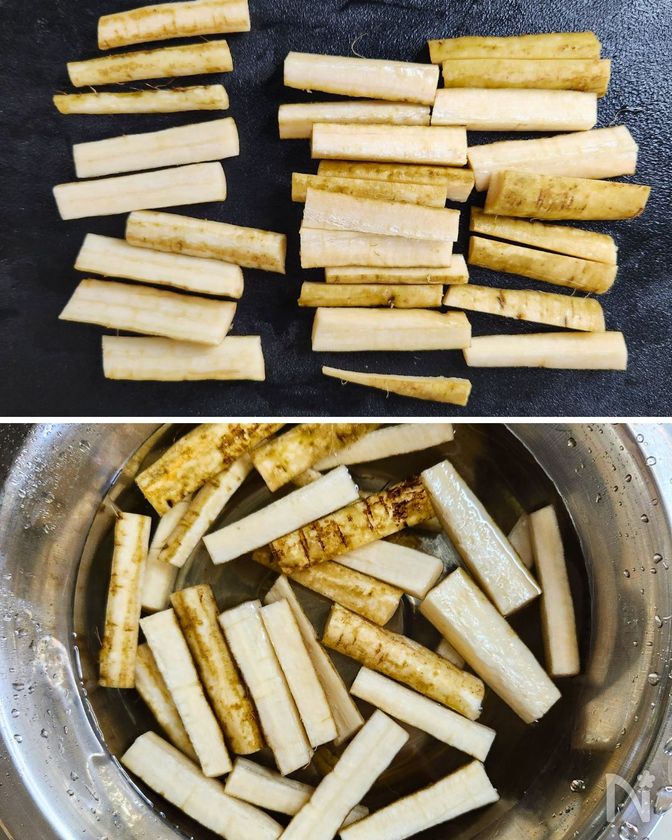 (1) ごぼうはたわしでこすって皮を剥き、5cm長さに切る。