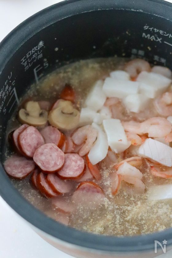 (1) 炊飯器の内釜に米、【A】を入れて水を2合目盛りまで入れたら、水けを切ったシーフードミックス、5mm幅に切ったジョンソンヴィル オリジナルスモーク、マッシュルーム(水煮)をのせて炊飯する。