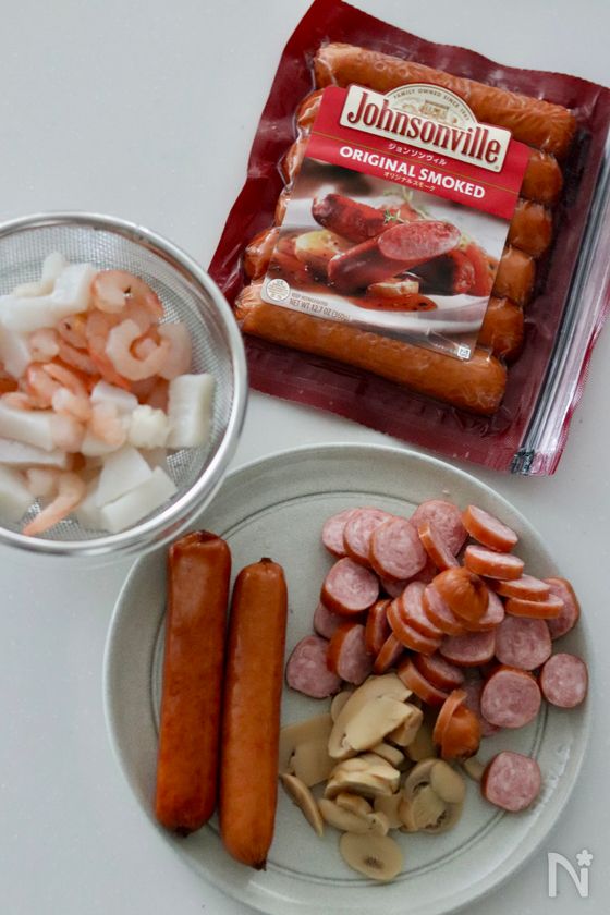 (下準備) ・冷凍シーフードミックスは解凍しておく。