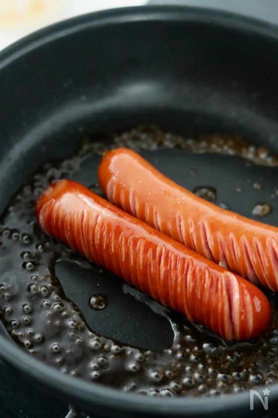 (2) 1を炊いている間にフライパンを中火で熱し、油をひかずに斜めに切り込みを入れたジョンソンヴィル オリジナルスモークを炒める。切り込みが開いてきたら【C】を加えて絡め、粗びき黒こしょうをちらす。
