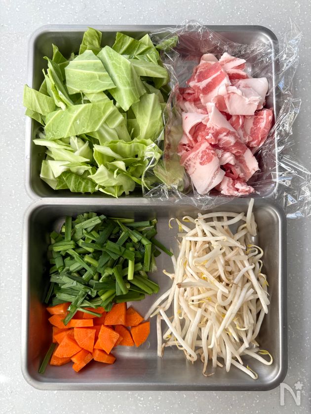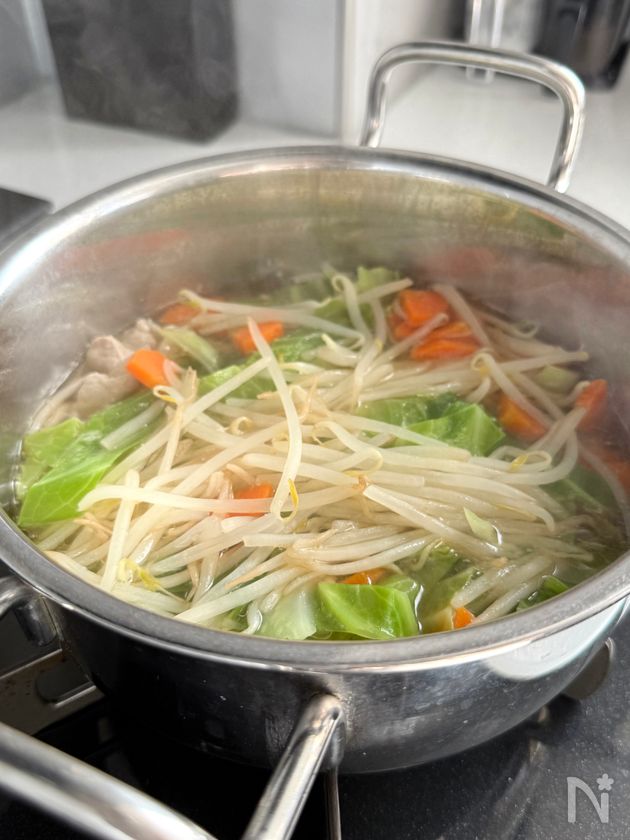 (3) キャベツ、もやし、にんじんを加えて蓋をして弱火で5分煮る。