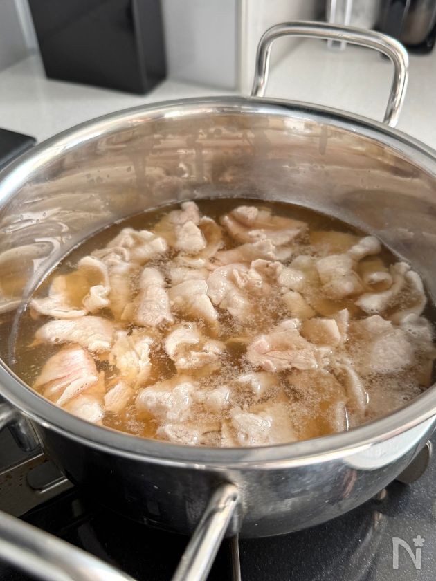(2) 鍋に【A】を入れて沸騰させたら、豚バラ薄切り肉を加え、アクが出たら取り除き、火が通るまで煮る。
