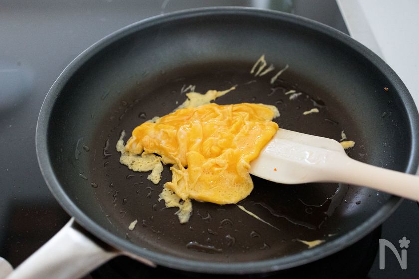 (4) (炊いている間に)卵に少々の塩(分量外)を加えてよく溶きほぐす。フライパンにサラダ油を中火でよく熱し、卵を炒めて取り出し、ほぐしておく。