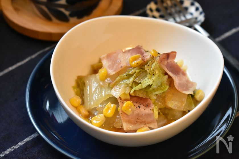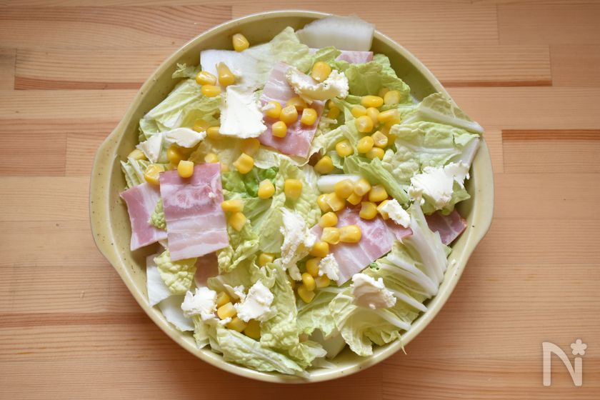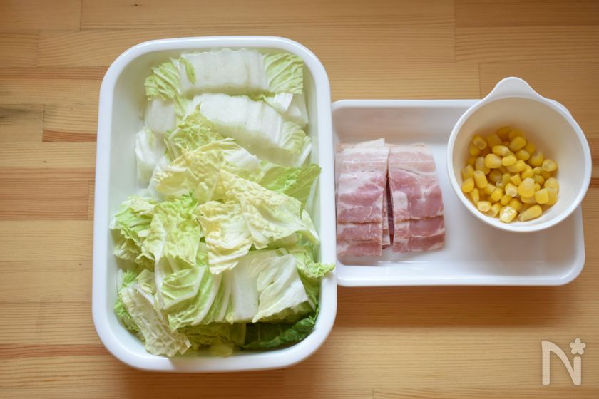 (1) 耐熱容器に白菜、ベーコン、白菜と層になるように並べ、コーンを散らす。【D】をところどころに置いたら、【E】を回しかける。ふんわりラップをし電子レンジで6~8分加熱し、5分置いて蒸らす。