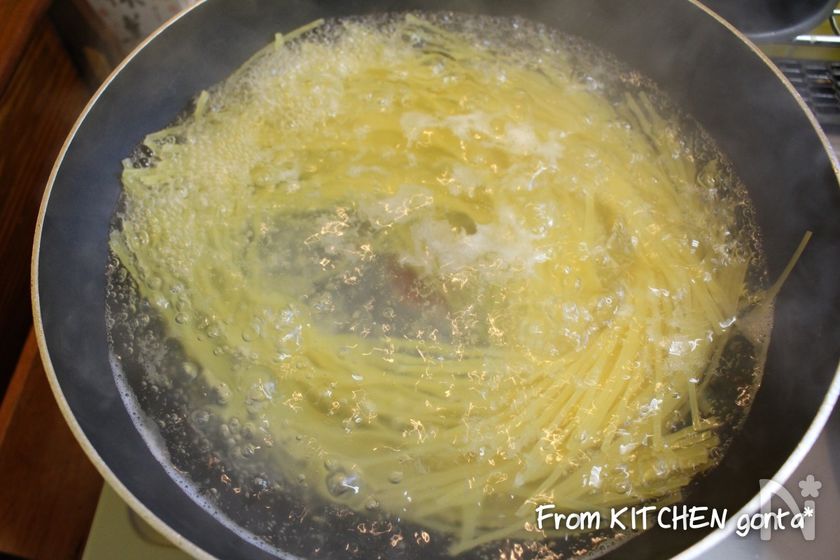 ❸パスタは、表示分数よりも1分半短めに茹でるとオイルに和えても、アルデンテになりますよ!