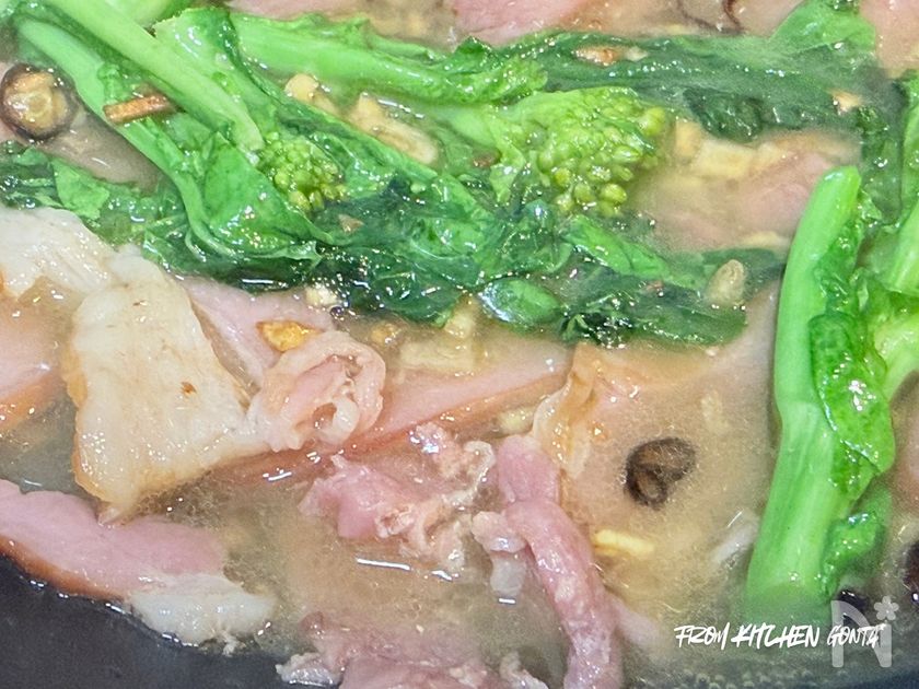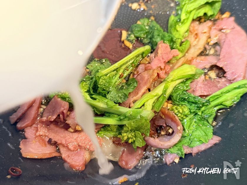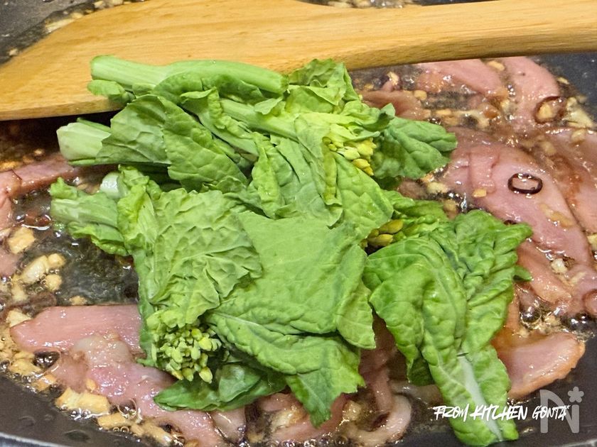 (5) ベーコンが炒まったら、なばなの茎部分を入れて炒める。