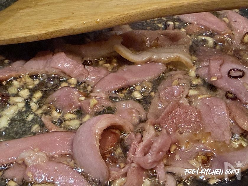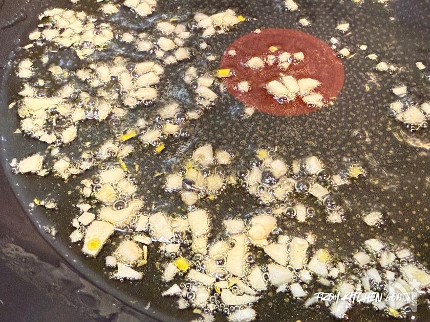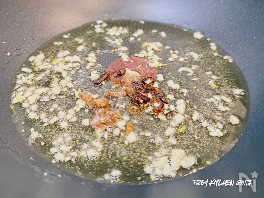 (3) フツフツしてきたら、唐辛子の輪切りとアンチョビを加えて炒める。