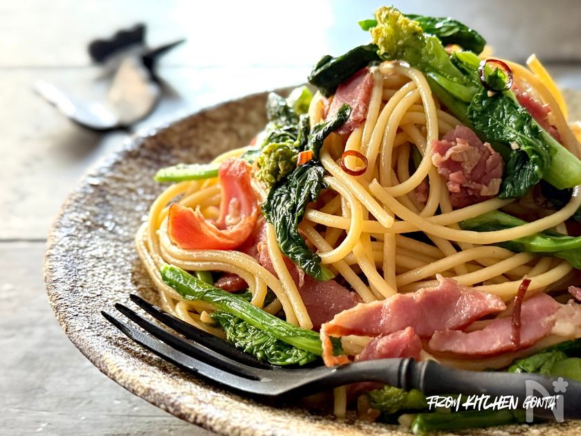 (下準備) アンチョビはみじん切り、ニンニクは粗みじん切り、ベーコンは5mmの短冊切り、なばなは茎と葉で分ける。【A】を混ぜておく。