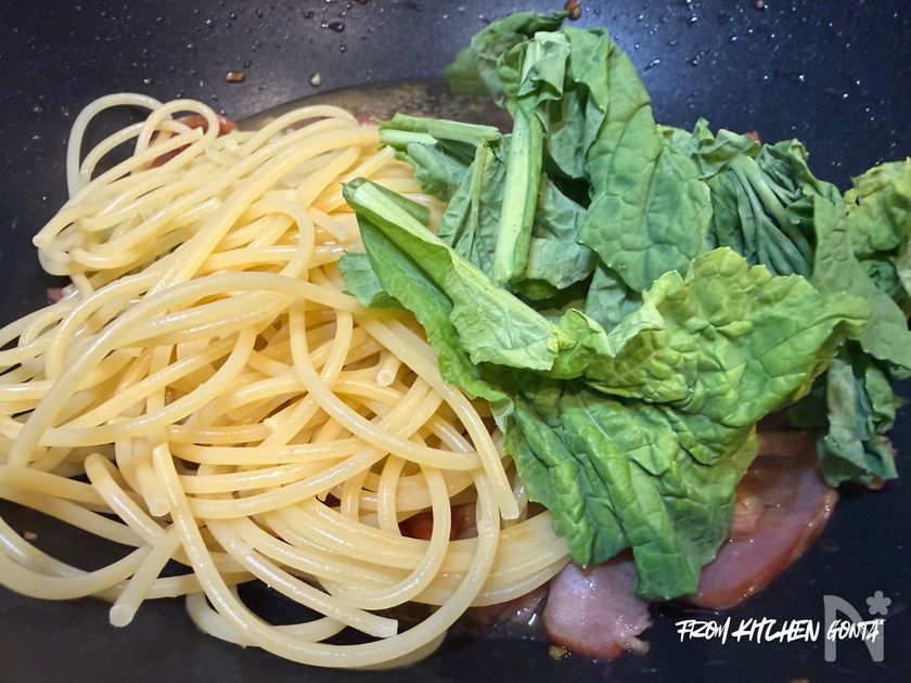 (8) 茹で上がったスパゲティとなばなの葉の部分を入れて、よく和える。