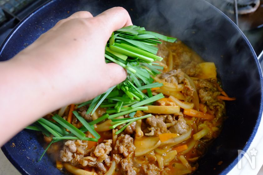 (3) フライパンに2⃣を入れて中火にかける。時々混ぜながら炒め煮していく。牛肉に火が通り野菜がしんなりしてきたら、ニラを加えて強火にし、少し水分を飛ばす。