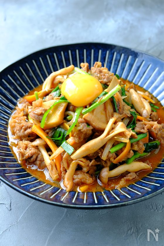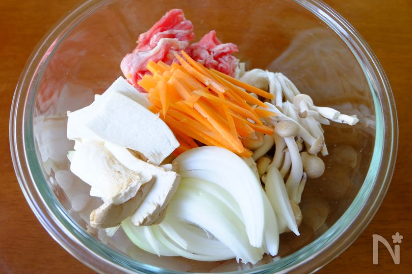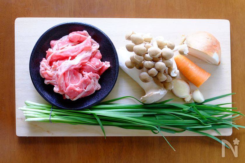 (下準備) 牛薄切り肉は食べやすい大きさに切る。しめじは石づきを切り落としてほぐす。エリンギは縦に半分に切ってスライスする。にんじんと玉ねぎは薄切りにする。ニラは5cmくらいの長さに切る。