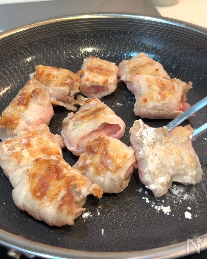 (4) フライパンを中火で熱し、巻き終わりを下にして丸めた豚バラ肉を乗せ、両面に焼き色をつける。