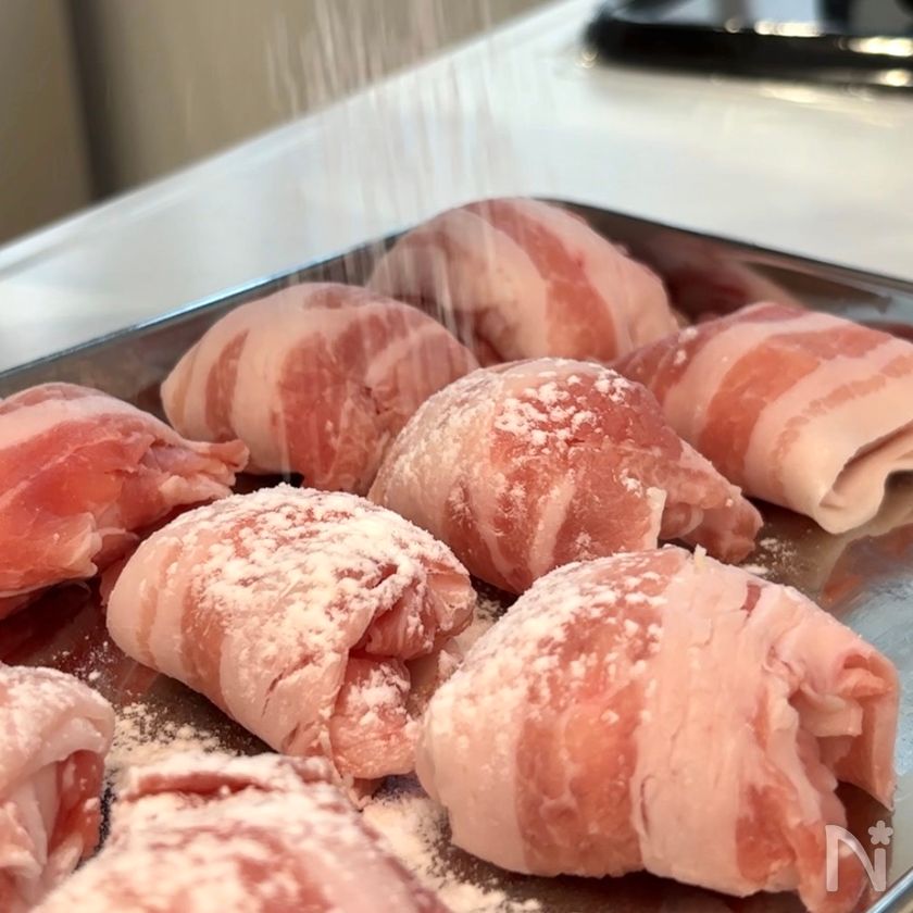 (3) 巻き終わった豚バラ肉に小麦粉をまぶす。