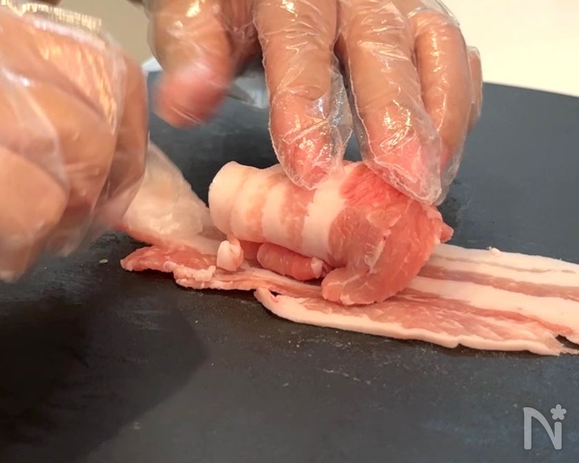 (2) さらにもう1枚豚バラ肉薄切りを広げ、1を縦にして乗せ、包むように巻く。