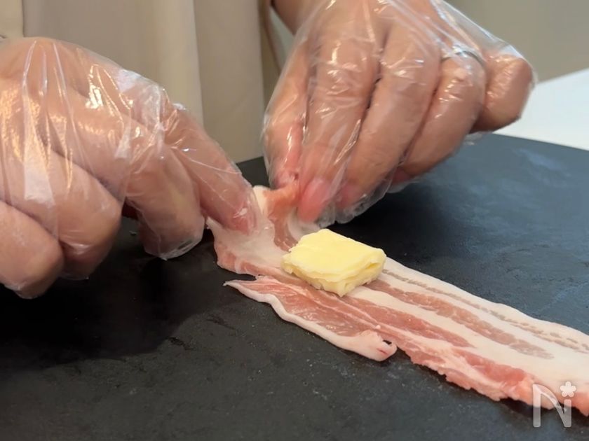 豚バラ肉薄切りを1枚を広げ、折りたたんだチーズを乗せて包むように巻く。