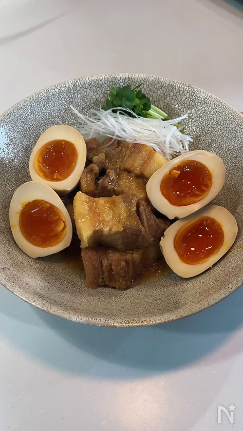 (3) 盛り付けて、煮卵,かいわれ大根,白髪ネギを添えたら完成。