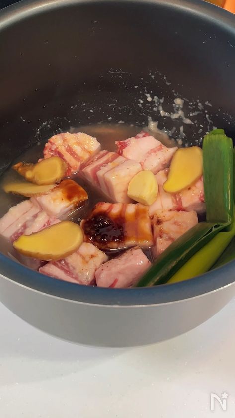 (2) 豚肉に【A】,生姜,ニンニク,ネギの頭,八角を入れ、炊き込みモードか雑穀米モードで炊飯する。