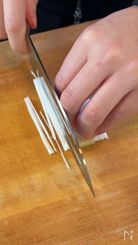 (1) ネギを千切りにして水に浸ける。生姜は薄切りにして、ニンニクは皮を剥き潰す。