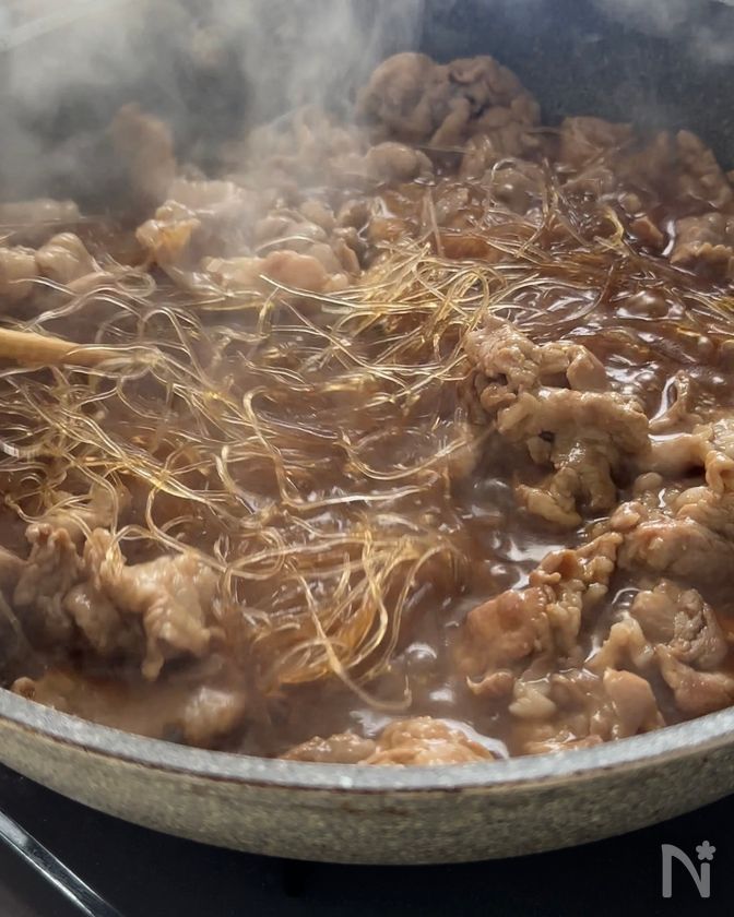 (3) 春雨、【A】を加えて、煮立ってきたら中火で4分ほど全体にほぐしながら煮る。