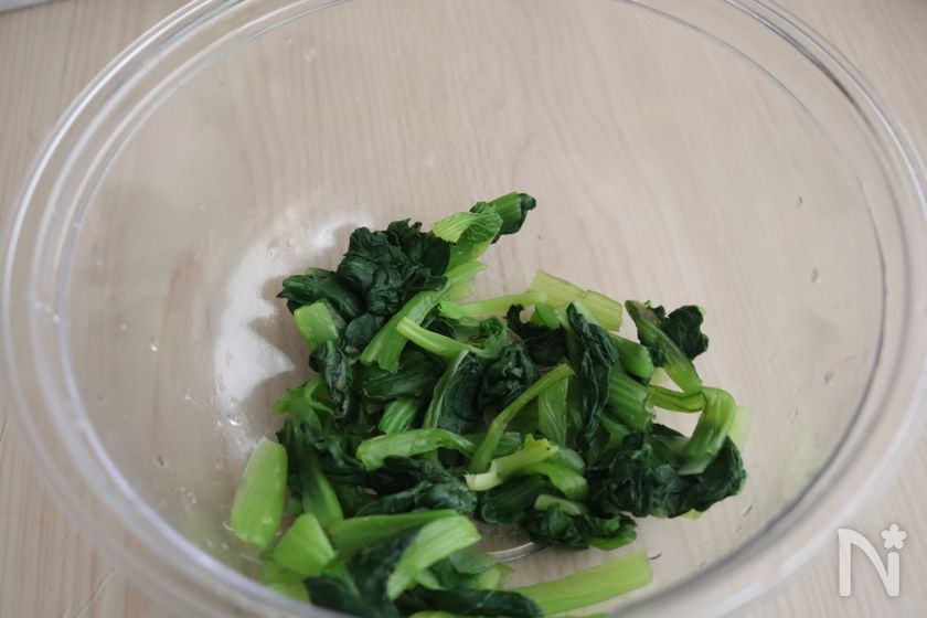 (2) ボウルに小松菜を入れてラップをし600wで2分加熱する。