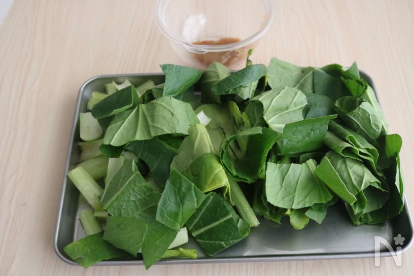 (1) 小松菜はよく洗い4~5cm幅に切る。