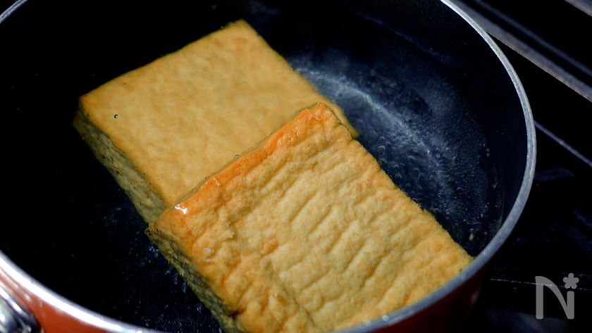 工程2)油抜きをすることで油の匂いを和らげ、調味料の味も染み込みやすくなります。油抜きの方法は熱湯をかける、ペーパーではさみ電子レンジで加熱するなどの方法もあります。